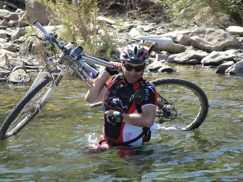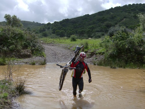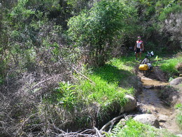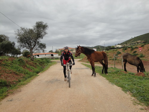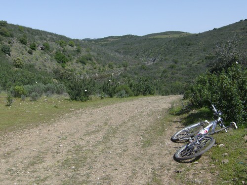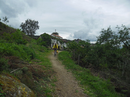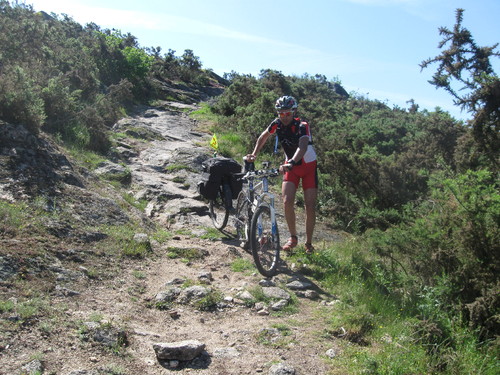 Cerca das 12H42 iniciámos uma descida por single track de declive acentuado, também bastante técnico e algo perigoso entre rochas e arbustos onde efectuámos algumas paragens para verificar a direcção da rota.