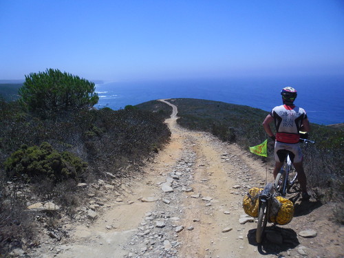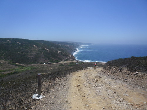 Mais uns kms e o trilho começava a ter piso mais irregular e a encontrar também alguns singletracks mais técnicos mas também mais interessantes e sempre com vista sobre o mar do lado esquerdo e a serra com alguns moinhos à direita.